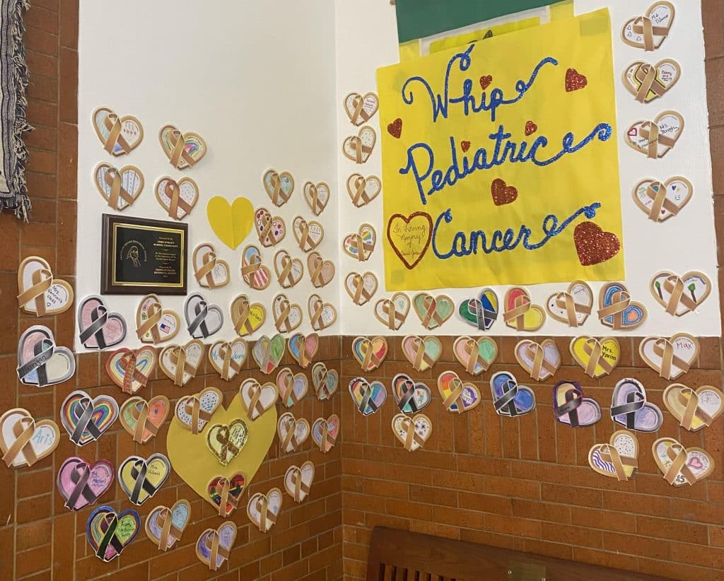 The school annually hosts this event in memory of David Jones, a former student who passed away in sixth grade from neuroblastoma. The students read “The Puddle Jumper’s Guide to Kicking Cancer” and decorated the sidewalks with chalk. Additionally, after receiving gold paper hearts from Whip Pediatric Cancer, sixth graders and staff decorated the hearts for display. The school raised $300, which is to be donated to Memorial Sloan Kettering.