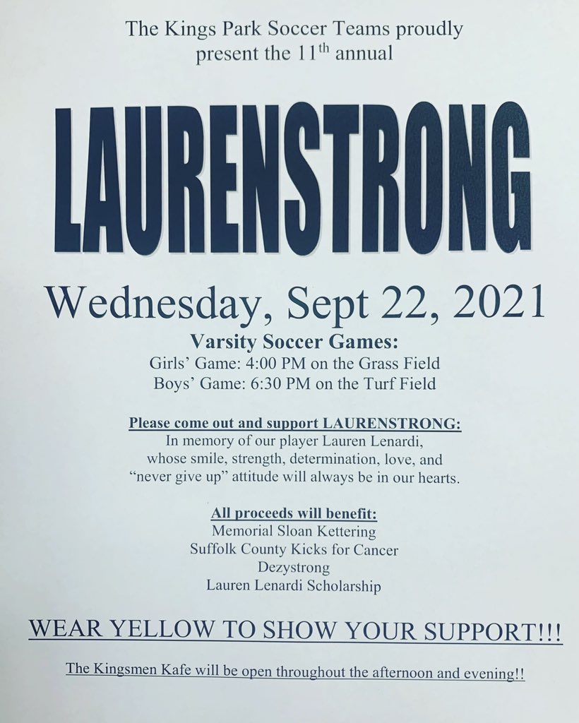 This game was created to celebrate the life of Lauren Lenardi and everything she stood for! As many of you know on March 1st 2013 our community lost one of the most amazing and influential people to have ever walked the halls of Kings Park High school. Lauren has left a larger than life impact on our soccer program and obviously on our community as well. She has taught us to live our lives the right way and to never take anything for granted. Her strength, courage, and integrity have inspired us to be better people. Through out everything Lauren went through, she always put others first and never lost her amazing smile. Lauren managed to turn our soccer program into our SOCCER FAMILY! We play this game every year to honor Lauren’s life and the legacy she has left… Lauren We Love You!!!!