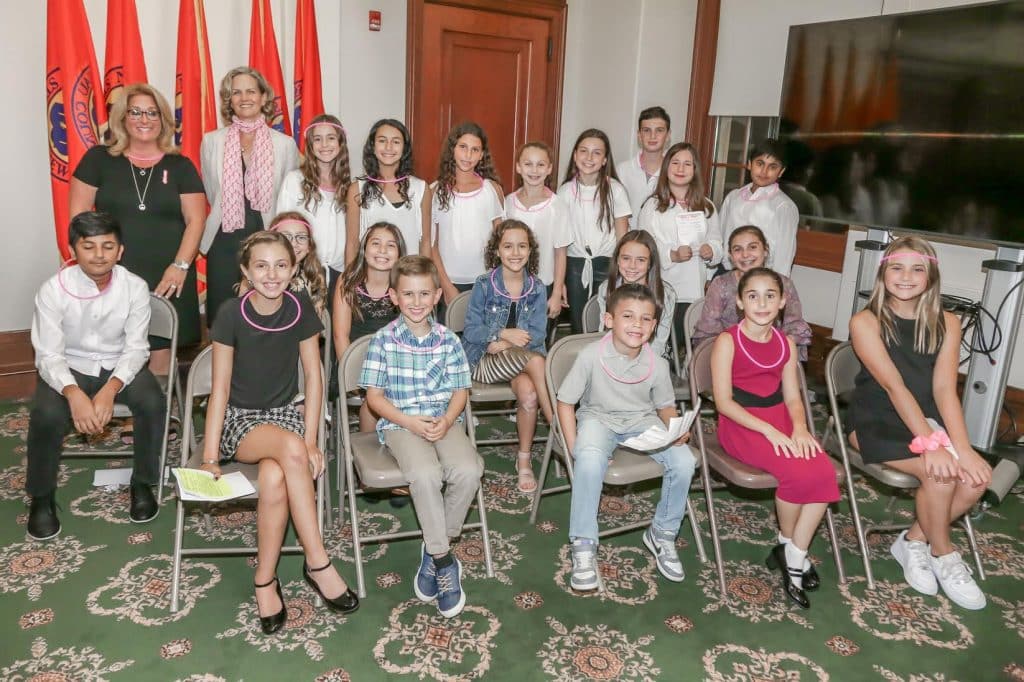 Students from Levy Lakeside School in Merrick who participate in yearlong service projects through the school’s service learning program were recently invited to share their experiences at the Nassau County “Glow of Hope” reception. The event served as a special kickoff to Breast Cancer Awareness Month. Lakeside students spoke about past and future efforts. Several of their service projects focused on the 1 in 9 Hewlett House, while others helped children with terminal illnesses. One grade level worked to ensure that Lakeside’s own incoming Kindergarteners were welcomed with open arms. The audience included Nassau County Executive Laura Curran, Hewlett House Director Geri Barish, Lakeside Principal Libby Trencheny and Assistant Principal Justin Gabrus. Hundreds of family members and friends were present to support the Lakeside Lions– the students who provide service to help others. Also in attendance were many of the Lakeside teachers including, student council adviser Soo Becchina. These teachers provided the support students needed in order to carry out their creative service projects. Hewlett House is a community learning resource center for cancer patients and their families that has served tens of thousands of cancer patients and their families. Last year, Lakeside Students created inspirational tissue boxes for the patients of the Hewlett House, and student council members also beautified the grounds and nurtured the vegetable garden there, an annual tradition.