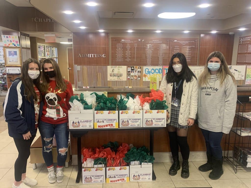 Photo caption: Smithtown High School West Leadership students in Joan Havranek’s class recently completed a project to recognized the hard work of the intensive care unit staff at St. Catherine’s Hospital in Smithtown. The class assembled 54 care packages – each containing a candle, Chapstick, hand cream, hot chocolate, a snack and a handwritten card –thanking the COVID warriors for their bravery and hard work during these past nine months. The students hand-delivered the packages to the hospital on Dec. 15.