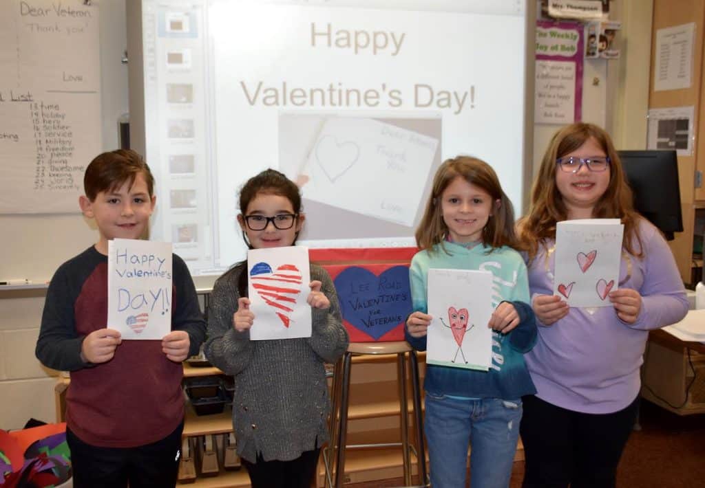 4) (L-R) Lee Road second-graders Jayden Keinath, Kiley Mateiko, Brooke Squicciarini and Emma Hoffman with their completed Valentine’s Day cards for local veterans.