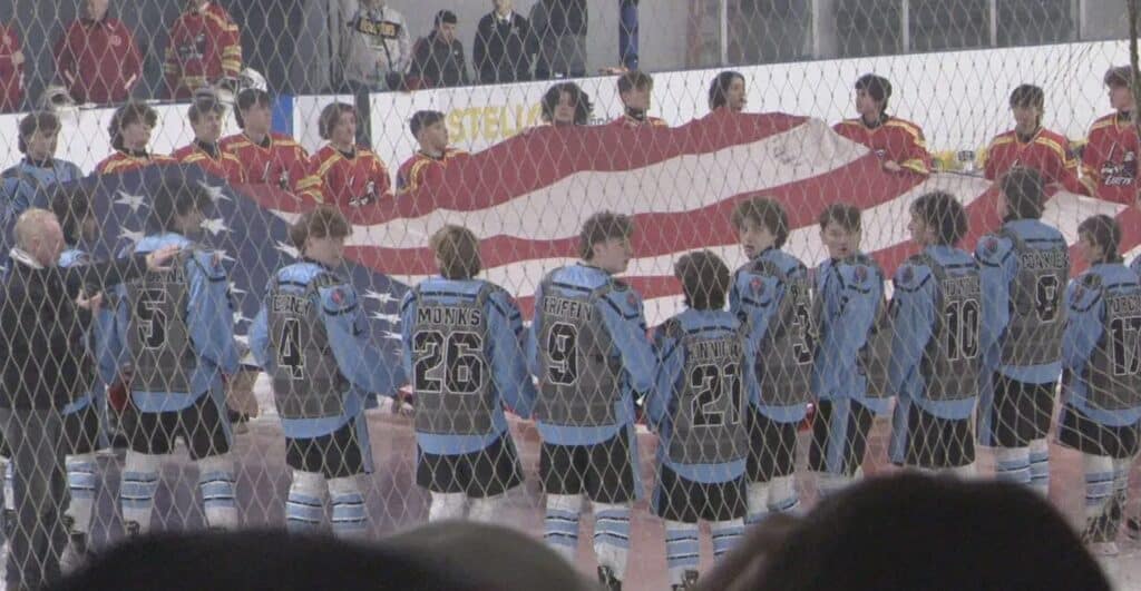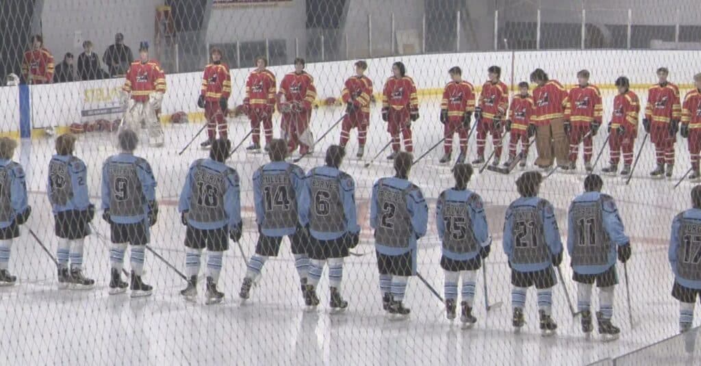 Greece, N.Y. — The varsity high school hockey teams for Greece and Hilton gave a special tip of the cap to first responders Friday night.
