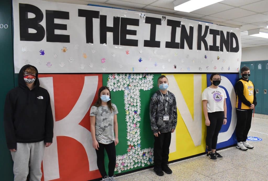 The Middle School organized numerous initiatives over the two days as well. A welcoming committee provided positive statements, purple ribbons and uplifting messages to those entering the building. Students wrote kind notes that were affixed to lockers and doors and also composed letters to special people in their lives. Additionally, they shared characteristics that define good friends and combined their responses to create a “caring quilt” displayed in the hallway.