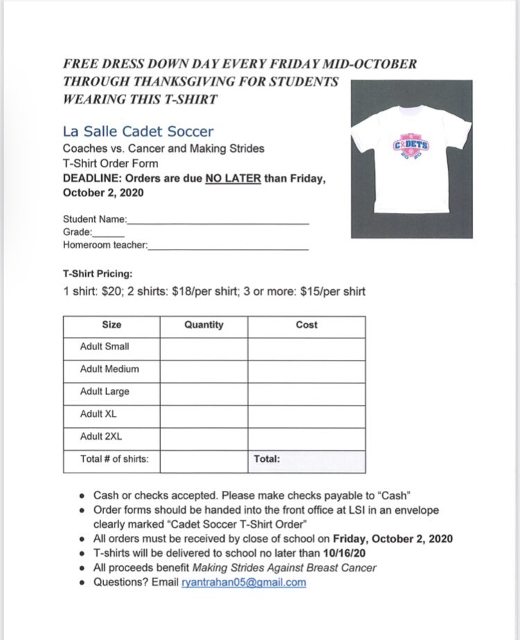 As a part of our school culture and mission, the soccer team has been involved in several community service opportunities each year. Over the years, we have volunteered with special needs athletes, wounded veterans, food pantries, the homeless etc. However, our “flagship” project has been our involvement with Making Strides Against Breast Cancer each season. Dating back to the 2013-14 season, Cadet Soccer has played a “Breast Cancer Awareness” game, raised donations for Making Strides and has participated in the walk in Albany. We reach out to local businesses for donations, have a raffle, sell tshirts to our whole school and of course play a game where we have special jerseys. Since its inception, we have raised over $50,000 for this cause. There have been several players/families over the years that have been the driving force behind this and at times they have single handedly breathed life into what has been accomplished. This year that individual is Ryan Trahan. His brother, Tyler, led the charge before that.