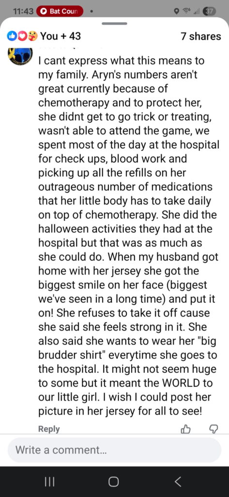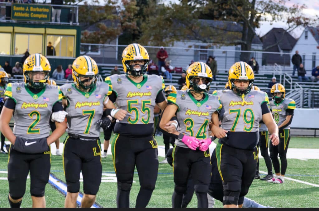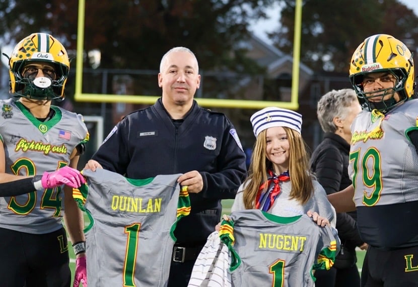 This year the Lynbrook Football Team played a Benefit Game entitled the Cure for Cancer Benefit Game. All money raised went to 2 young girls in the community who are fighting cancer: 6th grader with Medulla Blastoma and a 4-year-old with children’s Leukemia. Both girls were awarded special edition game jerseys and players helped raise money and receive candy donations in order to set up Trick or Treat Stations around the field for the children in the community and our two youngest heroes to have a safe trick-or-treat. The Football team raised $5k that went directly to the families to help them in any way possible. Commissioner of Nassau County Police, Pat Ryder, came to present the girls with these jerseys, escort them out on to the field, and do the ceremonial coin toss.