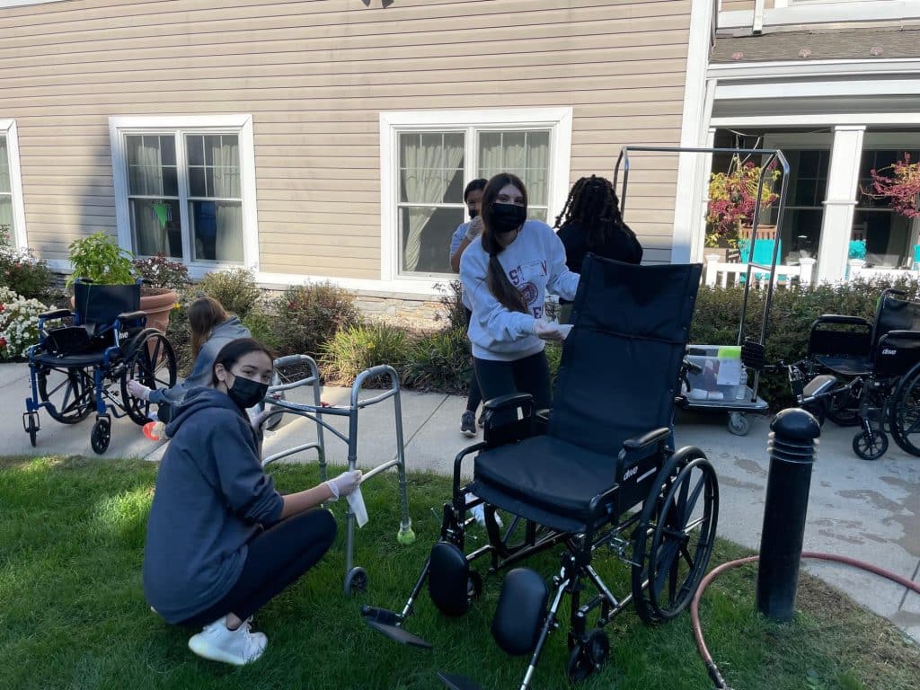 C: Lynbrook High School students Stephanie Neri (Sophomore), Katherine Ferng (Sophomore), Alexandra Spector (Junior), Amelie Duch (Sophomore) and Mischa Martin (Junior) volunteer to wash wheelchairs during a visit to the North of Sunrise Assisted Living Facility in Lynbrook.