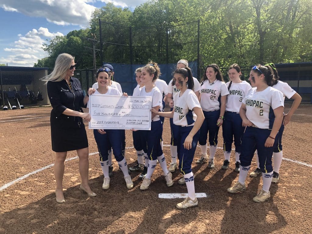 During the season Mahopac Varsity Softball hosted a fundraiser game for Community Cares, a non-for-profit organization that provides help for families of school-aged children who have a parent dealing with cancer or other major medical illnesses. We sold shirts prior to the game, and then baked goods and raffle tickets during the game with all of the proceeds going to Community Cares. All 12 girls participated in this event, and on May 16 we presented community cares with a 500.00 check.