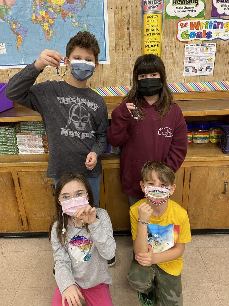 2) Third graders Lev Katz (top left), Julia Ioannou (top right), Heidi Benn (bottom left) and Slater Nonalaya showed off the bracelets they created.