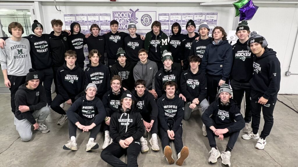 “We have played Hingham on New Year’s Eve for a lot of years now, and we talked last year about what we might do to give it more significance,” explained Marshfield High boys hockey coach Dan Connolly. “The Hockey Fights Cancer cause seemed like a natural to all of us, and when we went a little further, both schools and both communities really supported the idea. Our players especially really got behind it, and embraced the idea. I think every one of them knows someone, or has had someone in their family, affected by cancer, so they were very much behind the idea right away.”