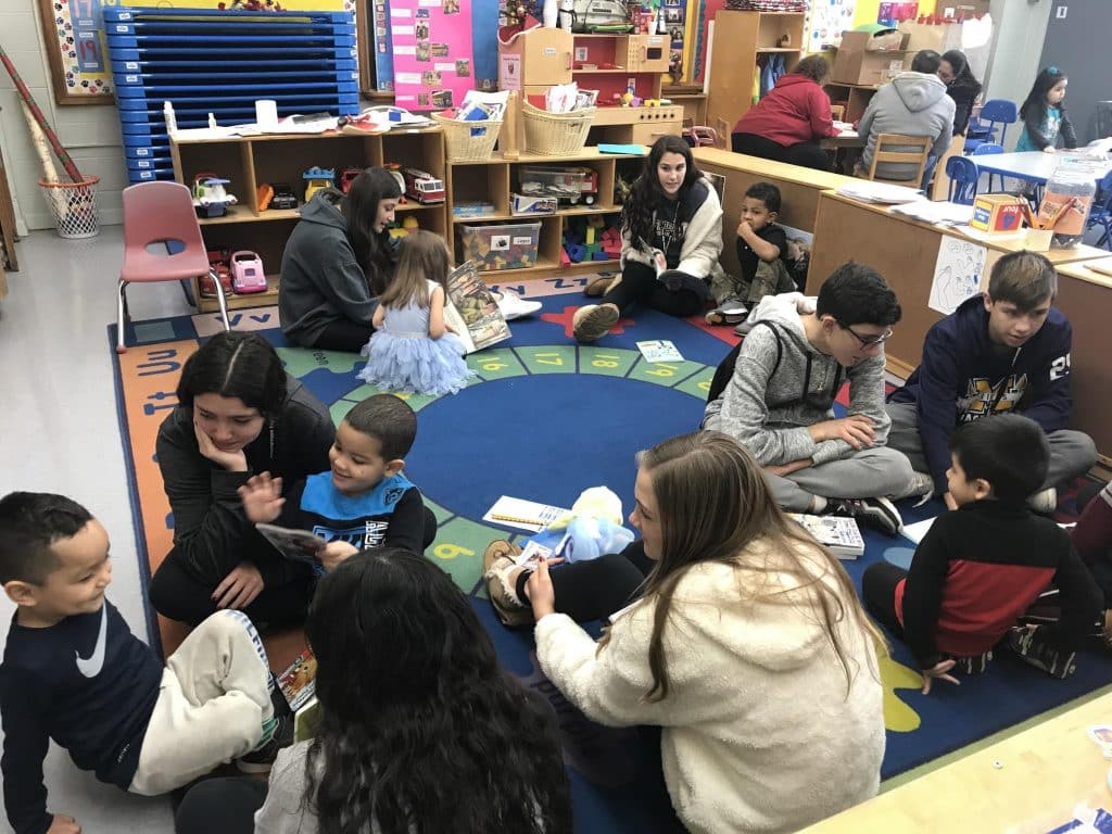 Photo caption: After delivering pajamas and books to children at the Amityville Head Start program, students in the Helping Hands club at Massapequa High School’s Ames Campus read to the preschool age children.