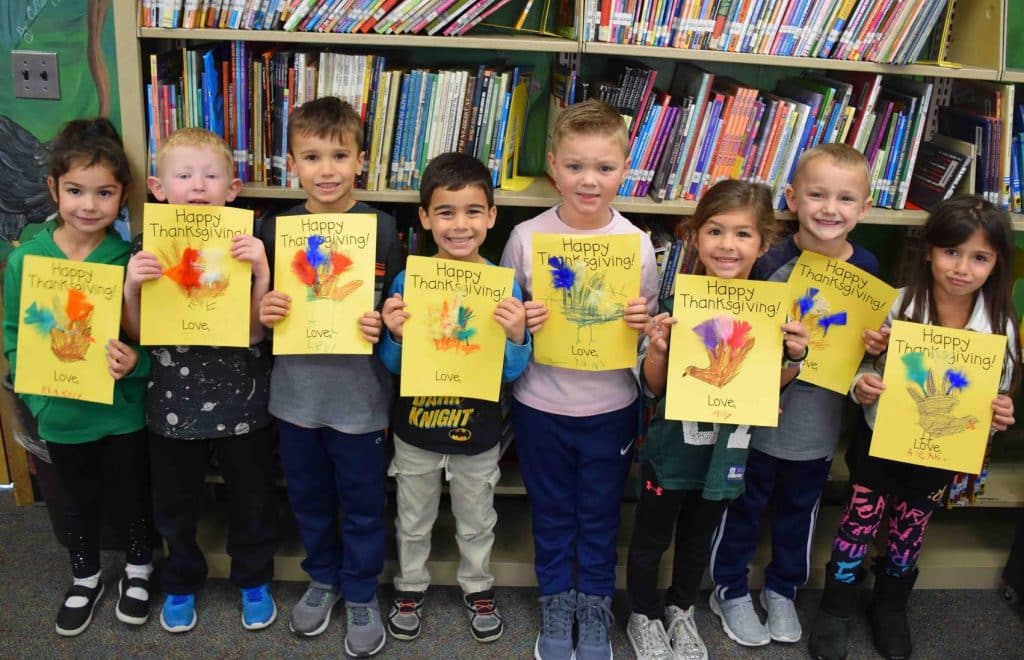 In the days leading up to Thanksgiving, Unqua students made cards to be included with each meal. They traced their hands with crayons, colored them in and added feathers to look like turkeys. Each child signed his or her name to give it a personal touch.