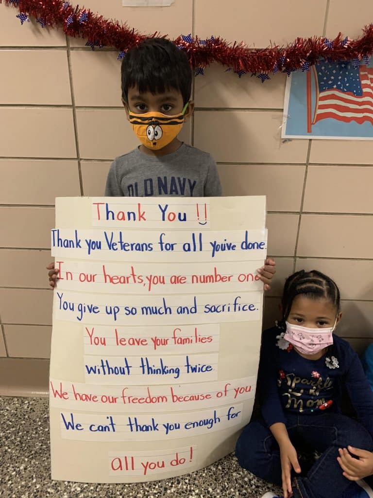 Prekindergartners in teacher Tammy Cotrone’s class at Deer Park’s May Moore Primary School honored Veterans Day on Nov. 9 by creating a special tribute to local veterans consisting of cards, patriotic windmills and a thank you poster. The gifts were then delivered to the vets at Babylon Town Hall. The students also brought in military family photos, which were put on display outside their classroom.