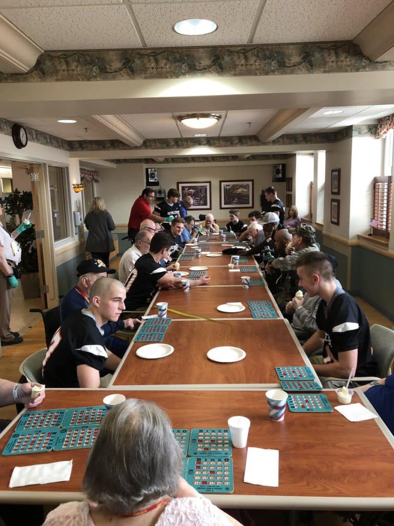 Members of the Bethlehem Varsity Football team volunteered at the Albany Stratton VA Hospital in Albany, NY. They played BINGO with the veterans and kept them company by talking about different parts of each other’s lives. They escorted Veterans to and from the community room where players provided snacks and juice while BINGO was being played. Players were appreciative of this opportunity to give back to those who allow them to play the game of football.