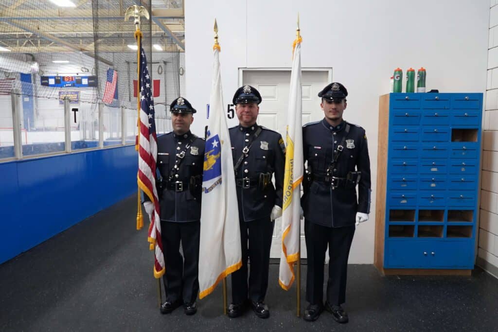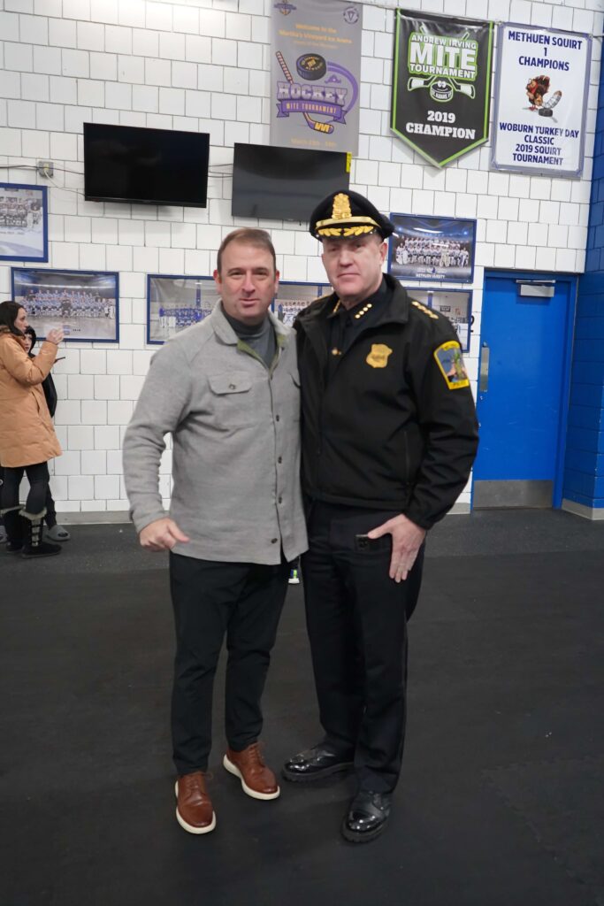 Prior to the game they welcomed members of the Methuen Fire, Methuen Police, Local Veterans, the Lawrence Vietnam Memorial and retired veterans of our hockey families to the ice to be recognized.