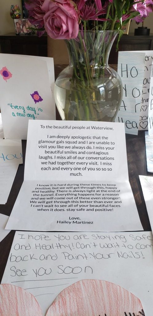 This is something we do monthly sometimes 2x a month we visit kohler senior center and Waterview in purdys. We do their nails and makeup of they want and keep them company. Since we are quarantined we are unable to go and we made cards for them. This was probably 2 hours Glamourgals.org is the national chapter