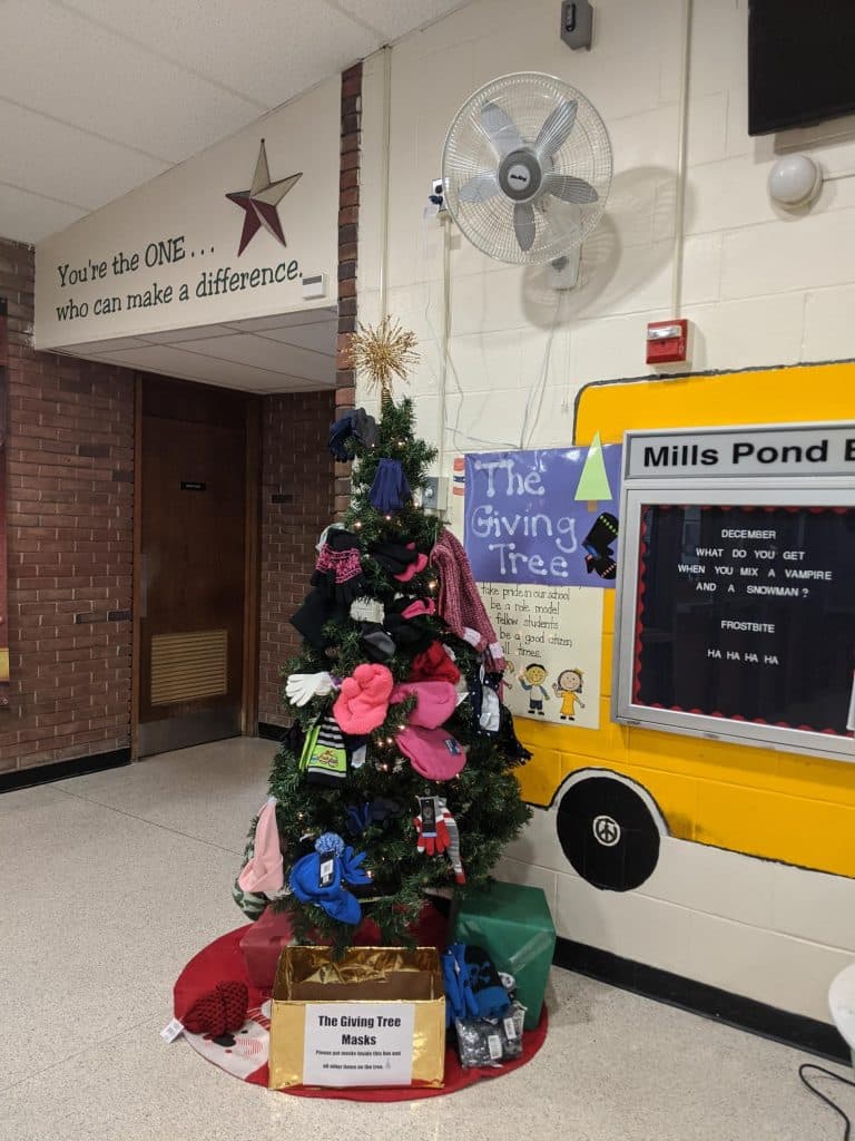Photo caption: Members of the Cares Club at Mills Pond Elementary School in the Smithtown Central School District organized a giving tree for a collection of hats, gloves, scarves and face masks for those in need in their local community. In addition, the club raised close to $900 for the Make a Change fundraiser. Each grade level competed by bringing in spare change to benefit the Make-a-Wish Foundation.