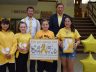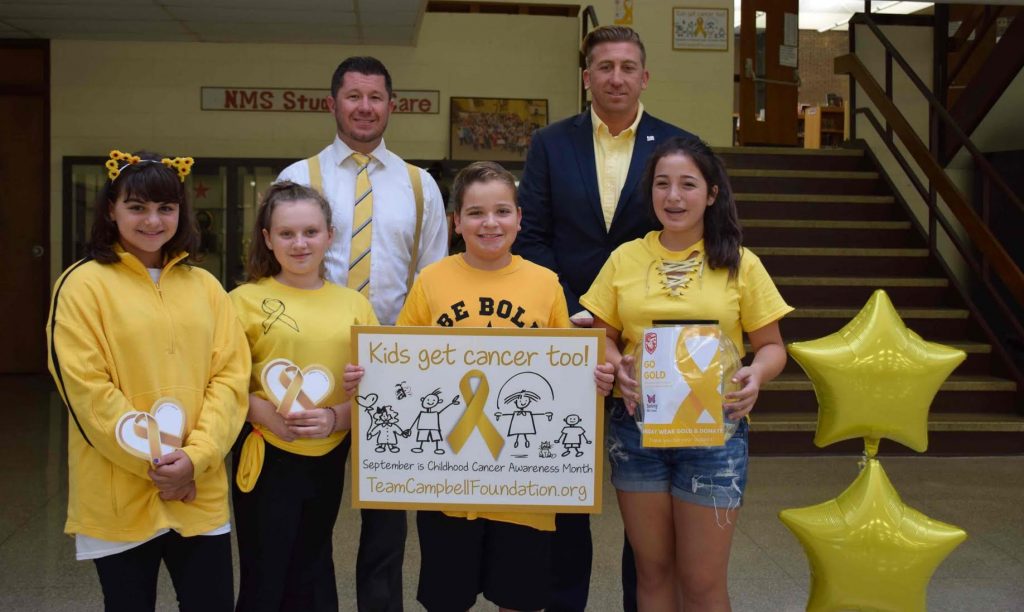 Photo caption: Nesaquake Middle School in the Smithtown Central School District helped raised money to fight childhood cancer by going gold on Sept. 28. Students are pictured with Assistant Principal Matthew Furey (left) and Principal Daniel McCabe.