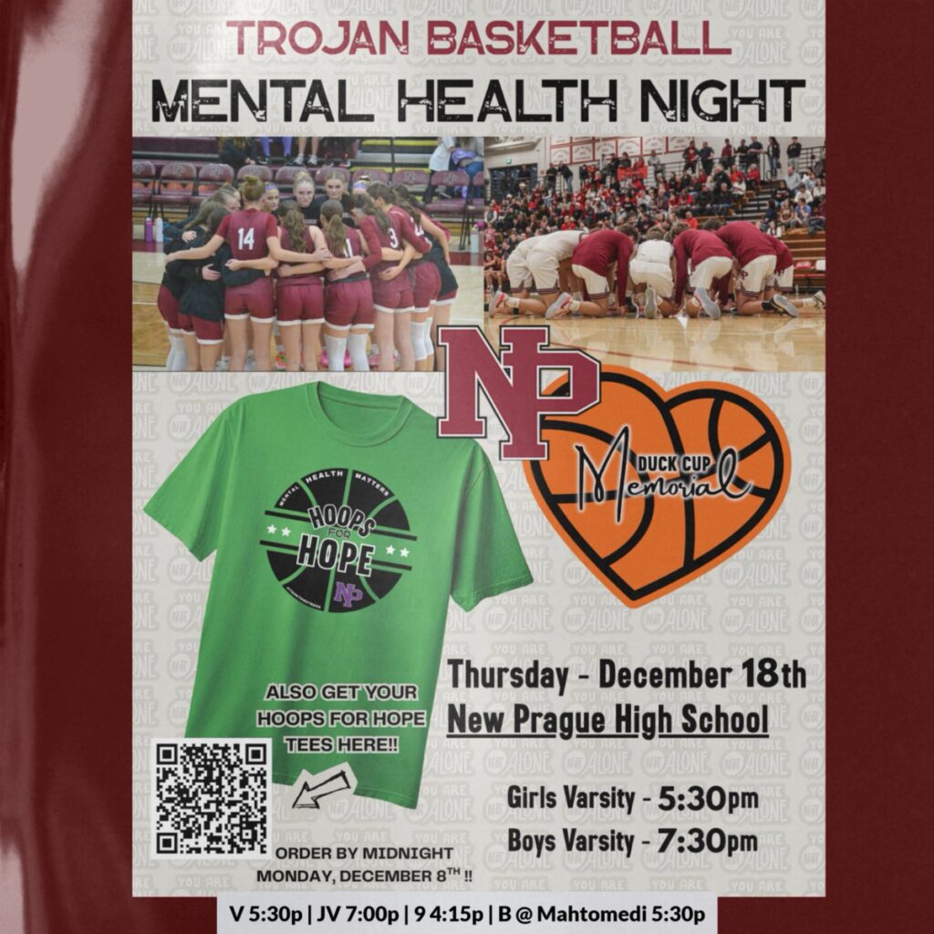 Held on December 18 during varsity matchups at New Prague High School, the event — known as the Duck Cup Memorial — focused on raising awareness about mental health challenges and reinforcing the message that no one has to face them alone. Players, families, and fans were encouraged to show their support by participating in themed activities and purchasing special “Hoops for Hope” T-shirts, helping create a visible show of unity throughout the evening.