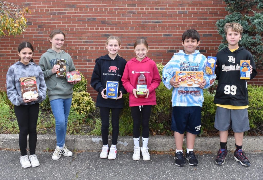 Photo caption: Newbridge Road Elementary School sixth graders, from left, Angelina Abbondondolo, Elyzabeth Kuchynskas, Liana Brugge, Emma Czyz, A.J. Navarro and Michael Imperiale helped sort donations for the Thanksgiving food drive.
