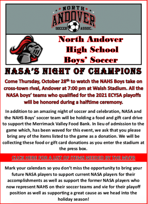 This project was a joint effort between our Boys Soccer program (head coach Kyle Wood) and our local youth soccer association (NASA, Scott D’Entremont). Scott approached Kyle with the idea of not charging for their last home game (also senior night) and instead asking people to make a donation to the Merrimack Valley Food Bank. The response was overwhelming…truly impressive.