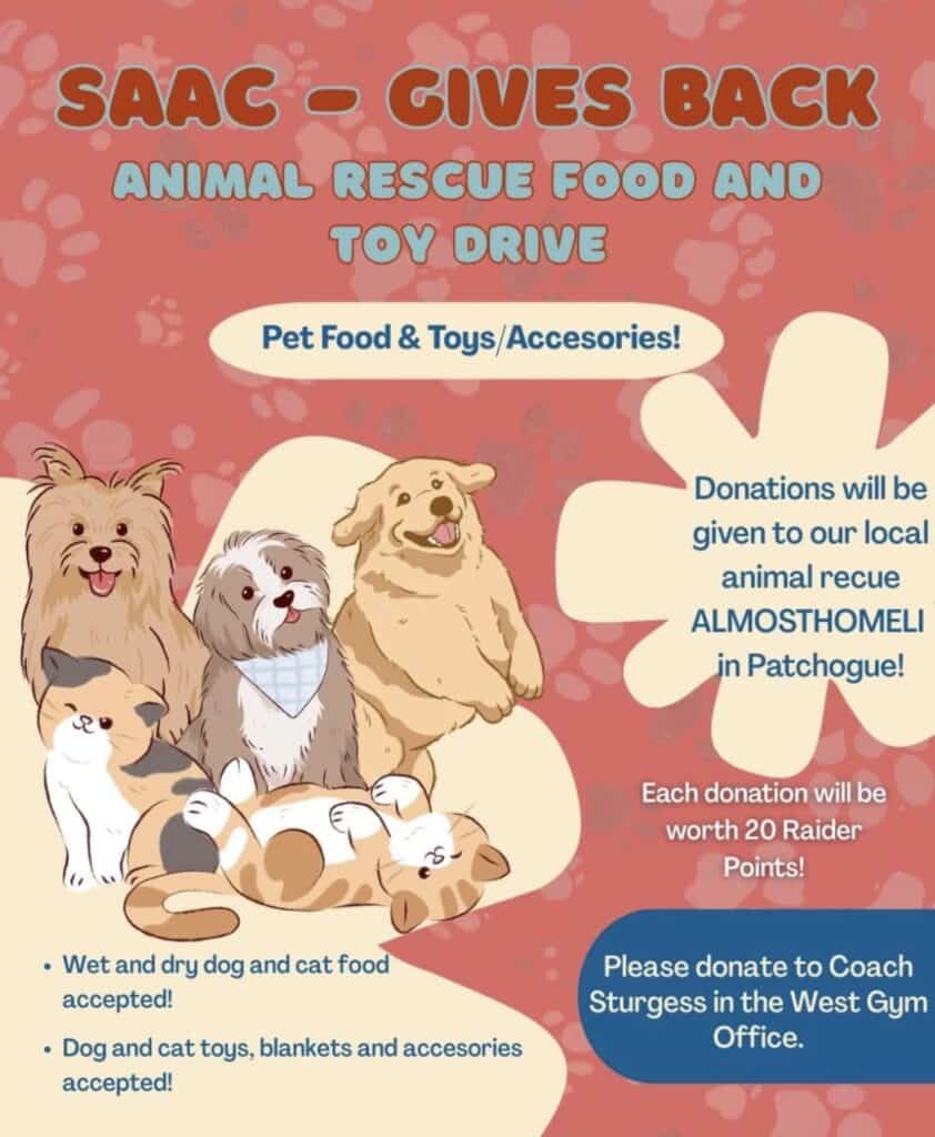 In addition to the toy drive, SAAC is collecting food, toys, and accessories for the local Patchogue animal rescue, @almosthomeli. This initiative reflects SAAC’s growing mission to serve the entire community — including its four-legged members.