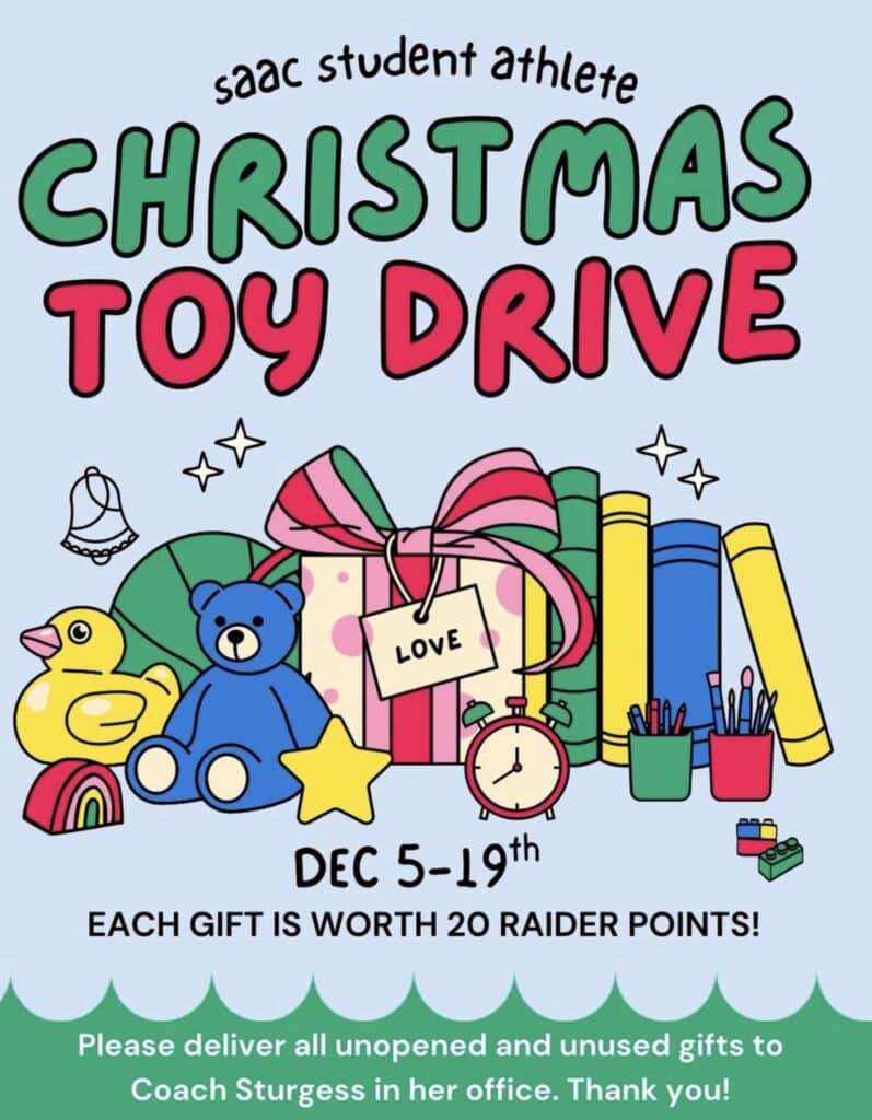 SAAC is inviting students, families, and staff to donate new, unopened toys to help give local children a memorable Christmas. Donations can be delivered to Coach Sturgess in the West Gym office, and the drive will run through Friday, December 19th, with toys being delivered immediately after.