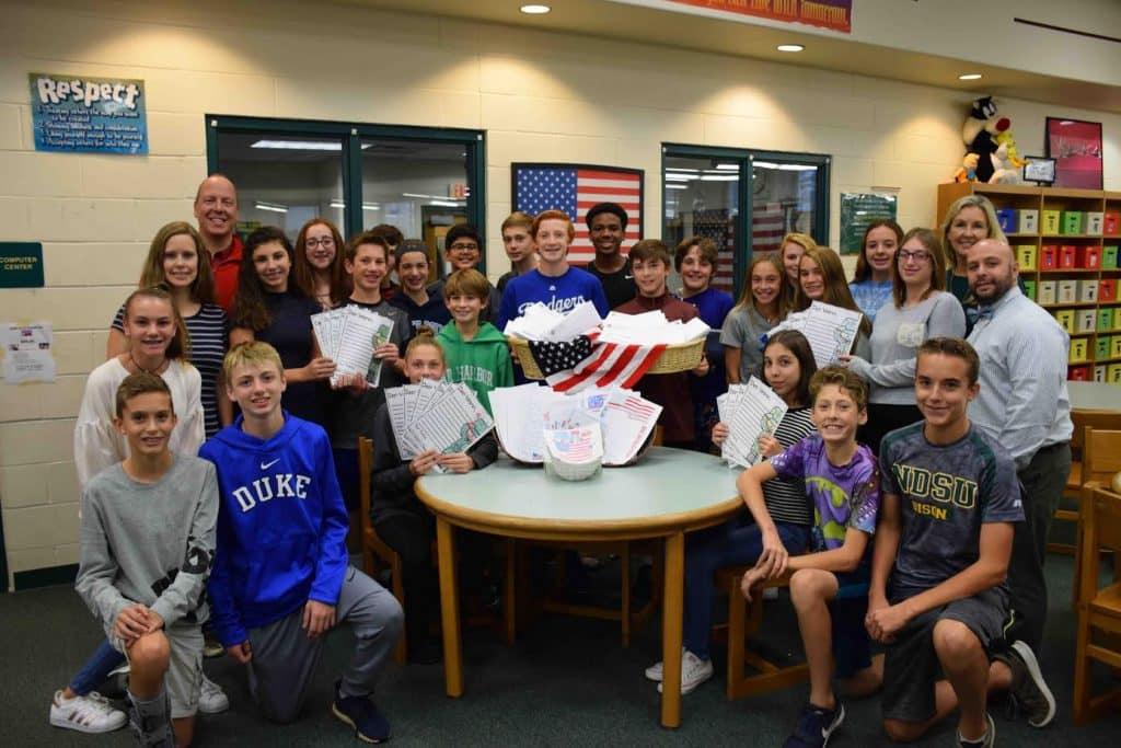Photo caption: Rocky Point Middle School students and staff members held many of the letters they created for local veterans in honor of Veterans Day.