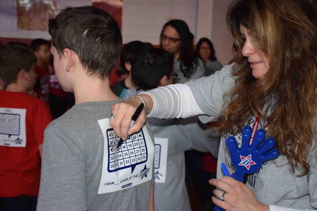 The track was set up in the gymnasium, and students completed between 30-35 laps as teachers marked off each lap completed on the back of each student’s shirt.