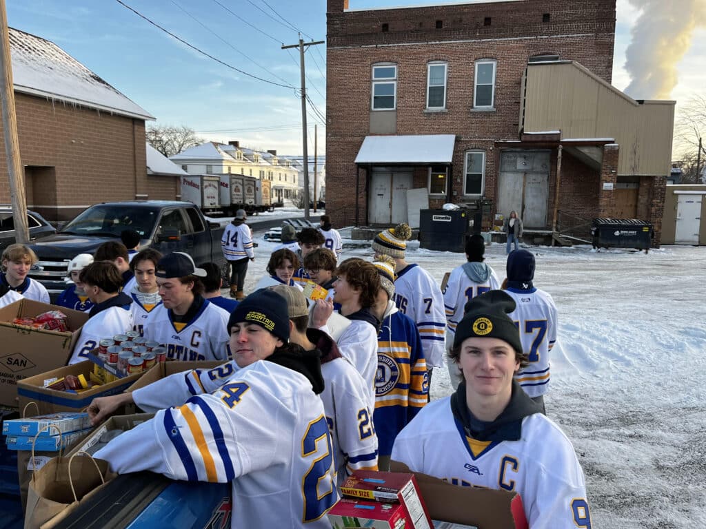 Each December, players collect non-perishable food items, which are stored throughout the month in the coaches’ office at the rink. Then, after the holidays—when the need often remains high—the team takes action. Following a practice, players head to Community Action wearing their game jerseys to help restock shelves and ensure families have access to essential food items.