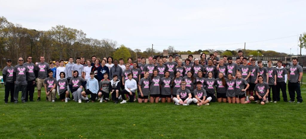East Islip High School’s boys and girls varsity lacrosse teams joined forces on April 29 to organize a special “Lax Out Cancer” event, selling shirts and raising more than $1,000 to benefit the Memorial Sloan Kettering Cancer Center. The project was spearheaded by senior girls player Melissa Sconone.