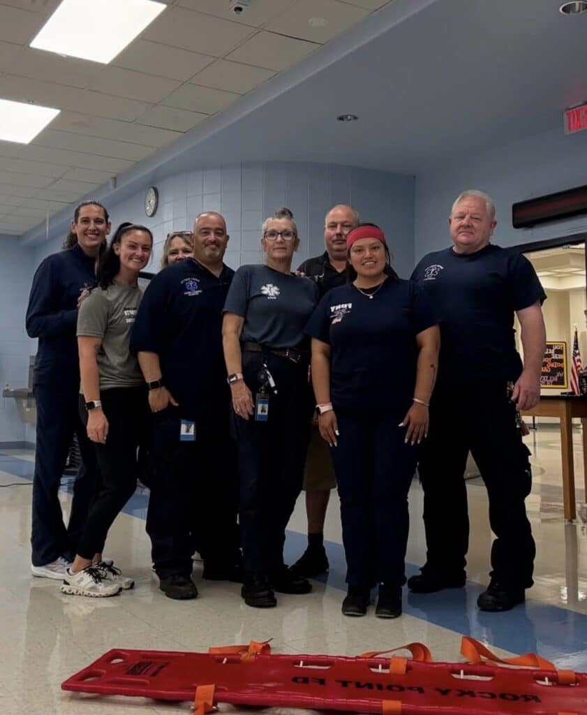 The training was made possible with the support of the Rocky Point Ambulance Company, sideline physician Dr. DeGiorgio, and varsity football players Christian Romero and John McKenna, who volunteered as “victims” for helmet removal and neck brace scenarios.
