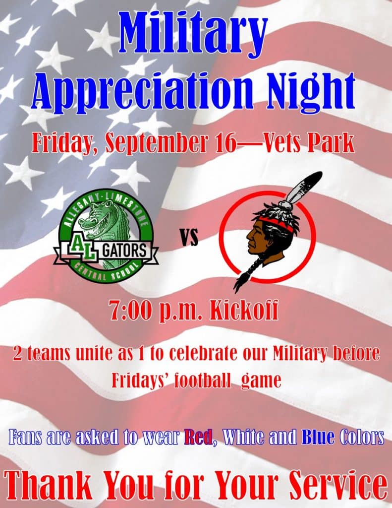 . It’s Military Appreciation Night. Fans please wear Red White and Blue to show support Veterans or active military in attendance are asked to join us on the field during the playing of the National Anthem. 7pm kickoff