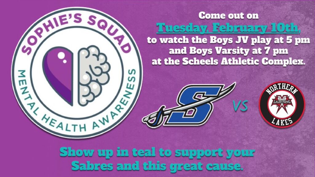 The event brought the Sabres community together at the Scheels Athletic Complex, as the boys’ JV and Varsity teams took the floor with a shared purpose: raising awareness, reducing stigma, and showing support for mental wellness. Fans were encouraged to wear teal in solidarity, turning game night into a visible show of unity and care.