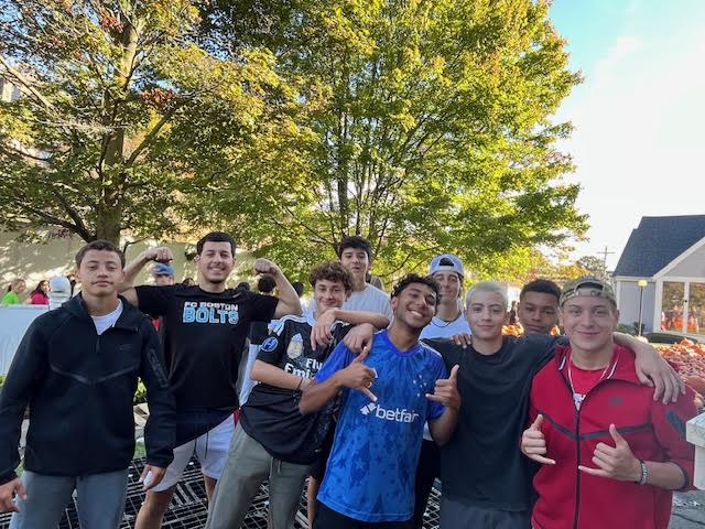 Student-athletes (Cross Country, Boys/Girls Soccer, Golf, Football) from Saugus High School, along with their coaches and local youth groups, recently came together to help unload pumpkins at the Congregational Church in the center.