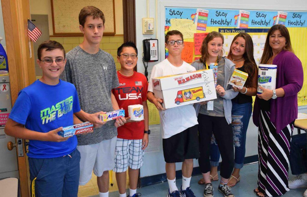 Photo Caption: Massapequa High School Ames Campus health teacher Denise Baldinger, right, was joined by ninth-graders who donated items for hurricane relief. The students brought in hygiene products and snacks to help the victims of Hurricanes Harvey and Irma. The items will be given to the Town of Oyster Bay’s collection drive.