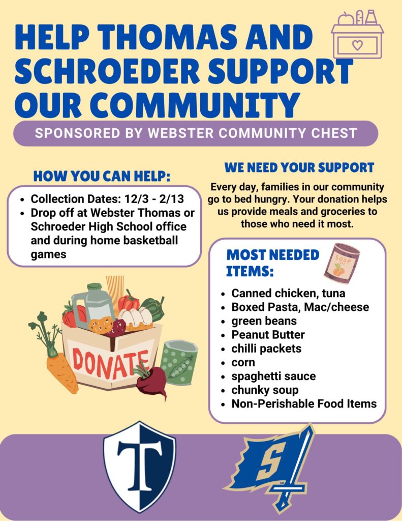 In addition to Warrior Read Day, Schroeder Boys Basketball also played a key role in supporting the Thomas and Schroeder Community Food Drive, sponsored by the Webster Community Chest. Through this initiative, students and families came together to help address food insecurity in the local community. Donations of non-perishable food items were collected at both Webster Thomas and Schroeder High Schools and during home basketball games, helping provide meals and groceries to families in need.