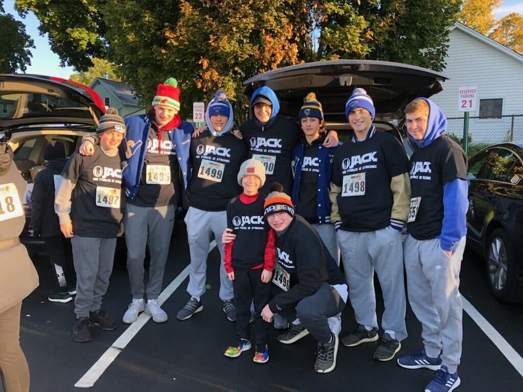 Schroeder Hockey team wanted to give back to the community and this was an important event for my family. Jack Harrison, my 8 year old cousin, was diagnosed with a brain tumor when he was 6. This awesome team stepped up and wanted to help out. Zach Simons and Brennan Albert are the captains of the Schroeder varsity team and were great role models. Cole Bollin, Ryan Darrow, Siraj Clark, Adam Monroe, Alex and Jason Simons all participated. (I included a picture of them with Jedi Jack) Some of the boys decided to run and some decided to walk, but they were all there to honor and support Jedi Jack! His Force continues to be strong!( I also included a picture of Jedi Jack’s full support) This was the first time Jack participated in the 5K, but hopefully will become an annual event for both him and the hockey team.