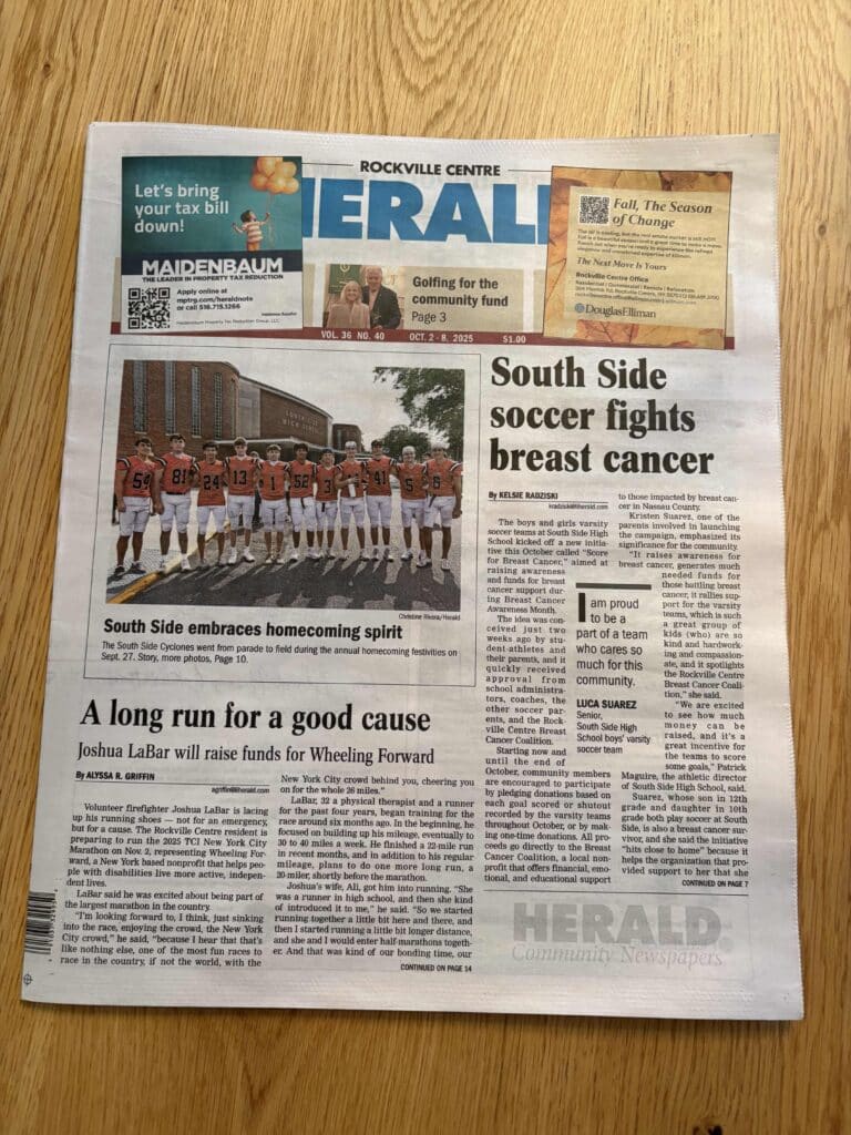 The South Side High School Boys and Girls Varsity Soccer Teams wanted to make an impact within our own community this October for Breast Cancer Awareness Month. They will be wearing pink wristbands which is a wonderful gesture and symbol of support but felt compelled to up the ante. The idea was conceived just three weeks ago and was greenlit into action quickly with the help of the SSHS Athletic Director, the coaches of both teams, and of course the Rockville Centre Breast Cancer Coalition. Truly that’s a testament to how much this community cares for one another.