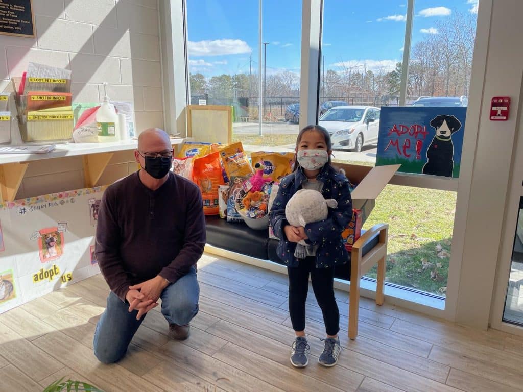 Photo Caption: Woodhull Elementary School second grader Arianna La Rose recently turned her birthday into a philanthropic project aimed at helping others. As part of her effort, she dedicated her past birthday to collecting toys and food for the animals at the Babylon Animal Shelter. Arianna is pictured with Chris Elton, former Woodhull parent and director of the Babylon Animal Shelter.
