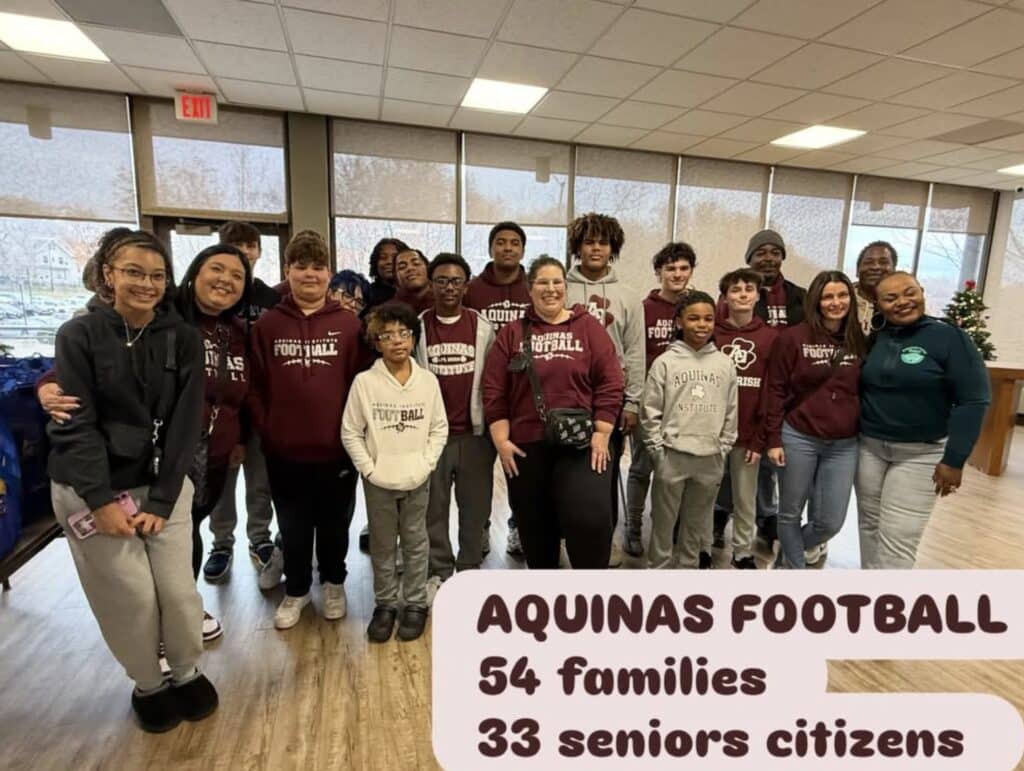 The Aquinas football program showed exceptional dedication, assembling and delivering Thanksgiving baskets while also supporting senior citizens in the community. Their players and families came together to make a meaningful difference during the holiday season.
