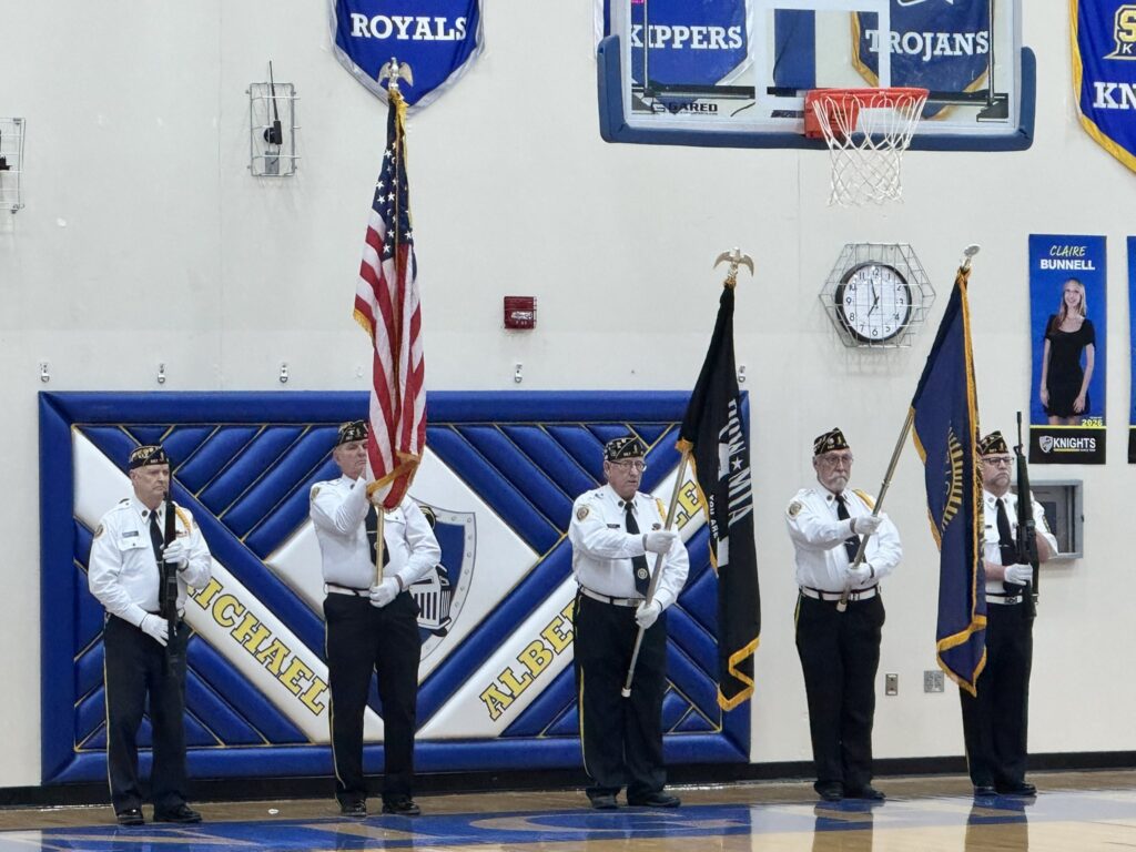 Before tipoff, the gym fell silent for a powerful Presentation of the Colors by the American Legion Post #567, setting a meaningful tone for the night. The ceremony served as a reminder of the freedoms protected by those who serve and the importance of recognizing their contributions within the community.