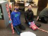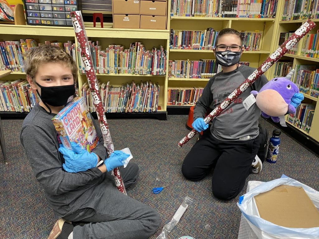 1) Fifth grade student council members Lucas Elena (left) and Christopher Morrissey helped wrap the toy donations.