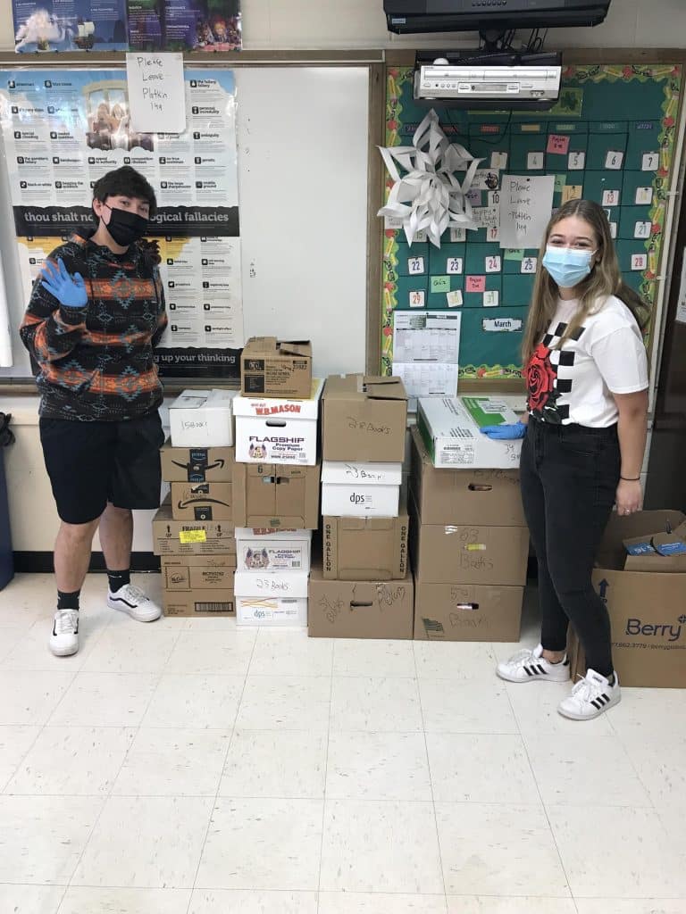 Photo caption: Carle Place High School National English Honor Society collected more than 600 books for its Books for Veterans book drive. Pictured from left are seniors Nicholas Pascarella and Chloe Santos.