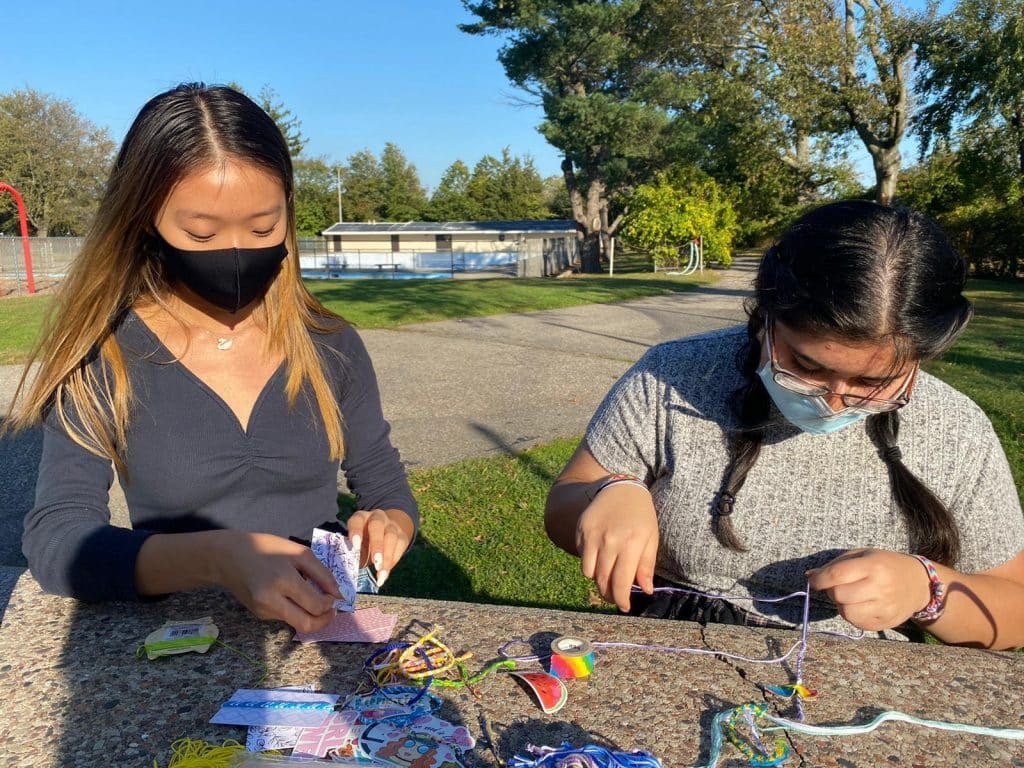 2) Division Avenue students Vicky Zhang (left) and Rhythm Osan created custom bracelets to include in a care package for a hospital.