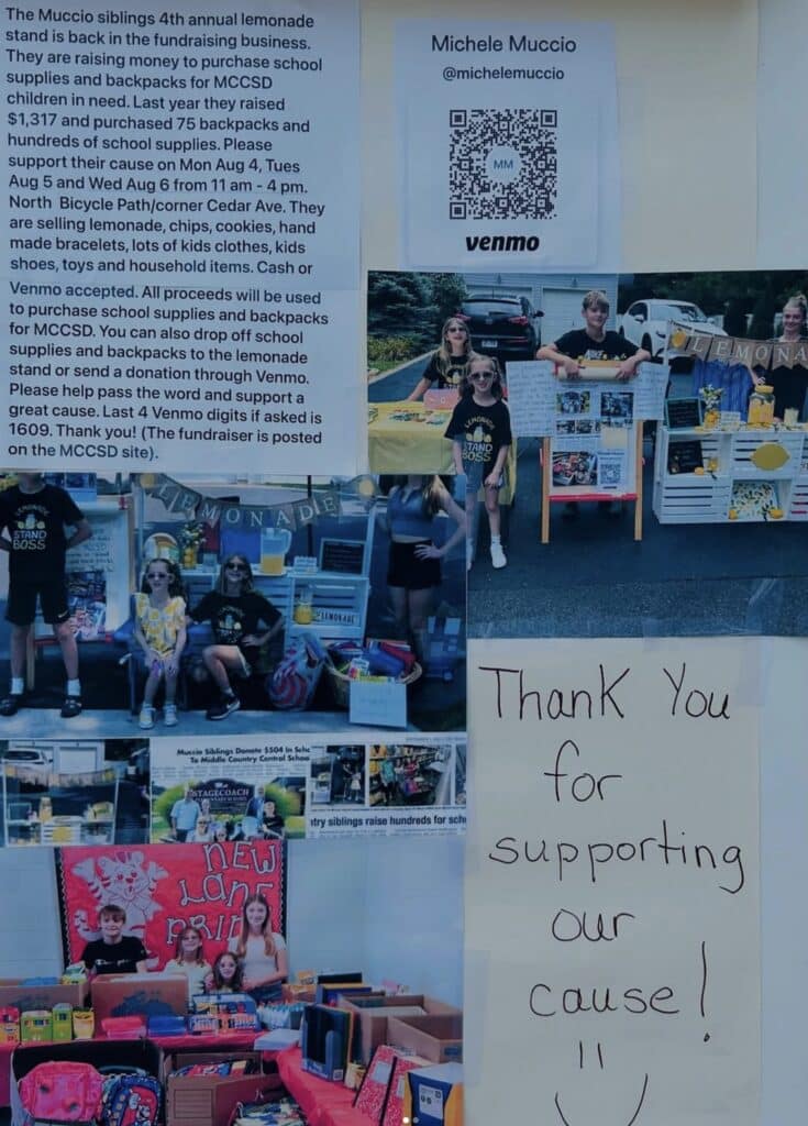 The Muccio siblings once again turned summer fun into community impact with their 4th annual lemonade stand, continuing their mission to raise money for school supplies and backpacks for children in the Middle Country Central School District (MCCSD) who are in need.