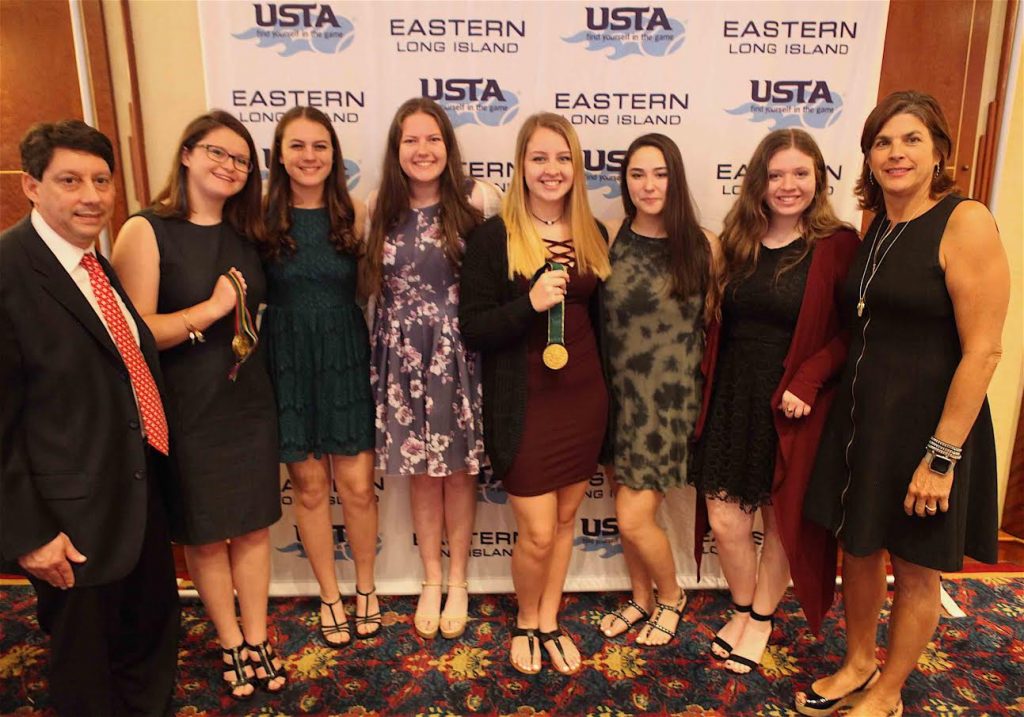 Photo Caption: Members of the MacArthur High School girls tennis team were recognized at the USTA Long Island Region awards dinner and are pictured with (left) USTA Long Island President Jonathan Klee and International Tennis Hall of Fame member Gigi Fernandez.