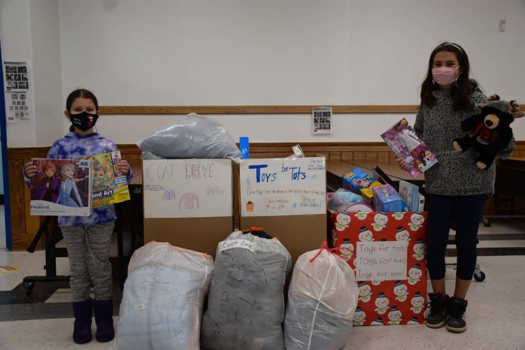 Photo caption: From left, Wantagh Elementary School student council representatives Alexandra Barretta and Juliet Mercus are pictured with the overflowing bins of toys and coats for needy residents in Wantagh this holiday season.