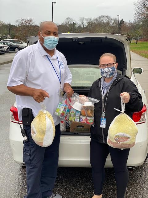 Photo caption: Deborah Nigrel, Riverhead High School student and community service specialist, and social worker Maritza Santos (not pictured) recently delivered Thanksgiving turkeys donated by Island Harvest and boxes of food to local families in need. Along with the food were gift cards from the Real Life Church in Wading River. Pictured with Nigrel is security guard Tim Crump.