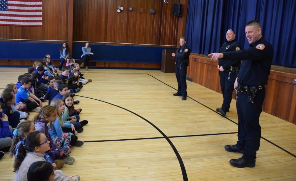 1: Police officer Matthew Mikowski visited Jill Corson’s third grade class at Unqua Elementary School on Jan. 9 for Law Enforcement Appreciation Day.