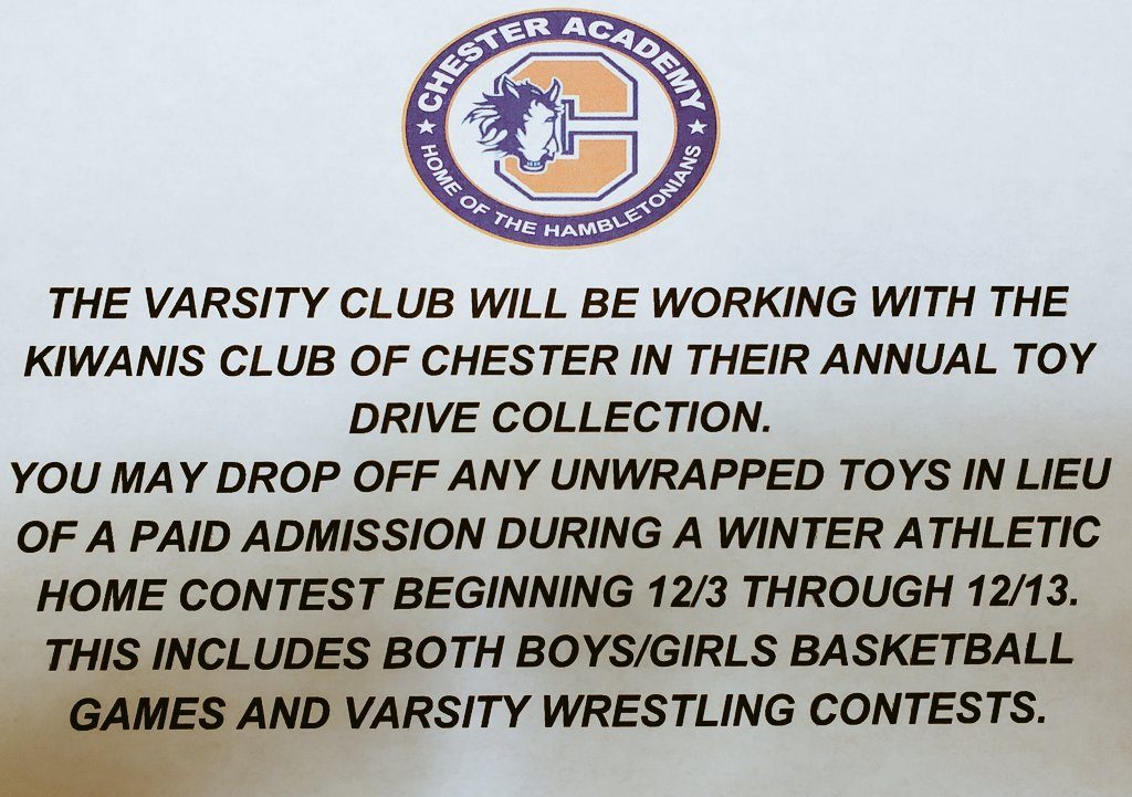 The Varsity Club will be working in conjunction with our Kiwanis Club of Chester in collecting/donating unwrapped toys for our annual toy drive. The Kiwanis Club throughout the year raises money and works with various clubs and organizations that donate toys, gift cards and coats they will be used as gifts for the needy during a one day event. All gifts are grouped by ages. We are helping out this year by asking for toys and collecting them in lieu of a paid admission to our Boys/girls basketball games and home wrestling matches during the next 2 weeks. I have challenged all of our winter athletic members to donate 0ne gift per person per team. Lets hope for the best.